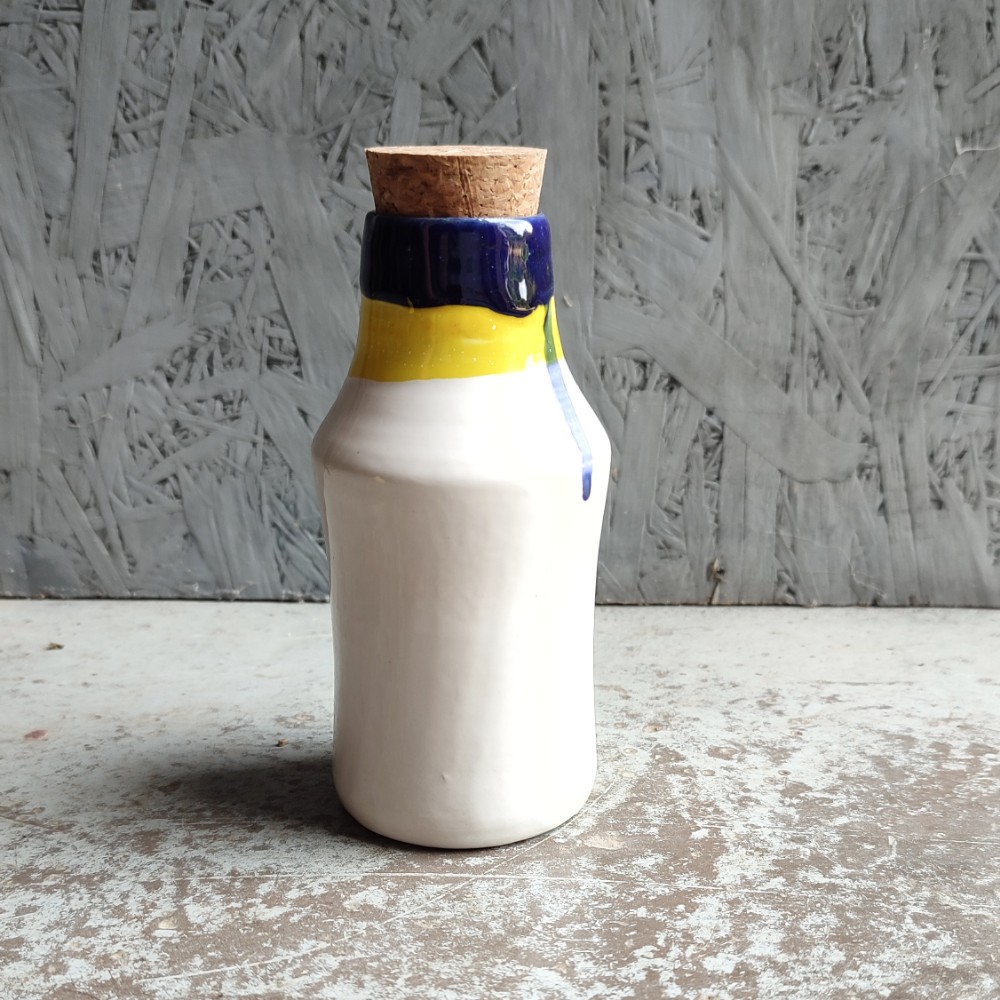 Bouteille en grès blanc émaillée bleu cosmos & jaune