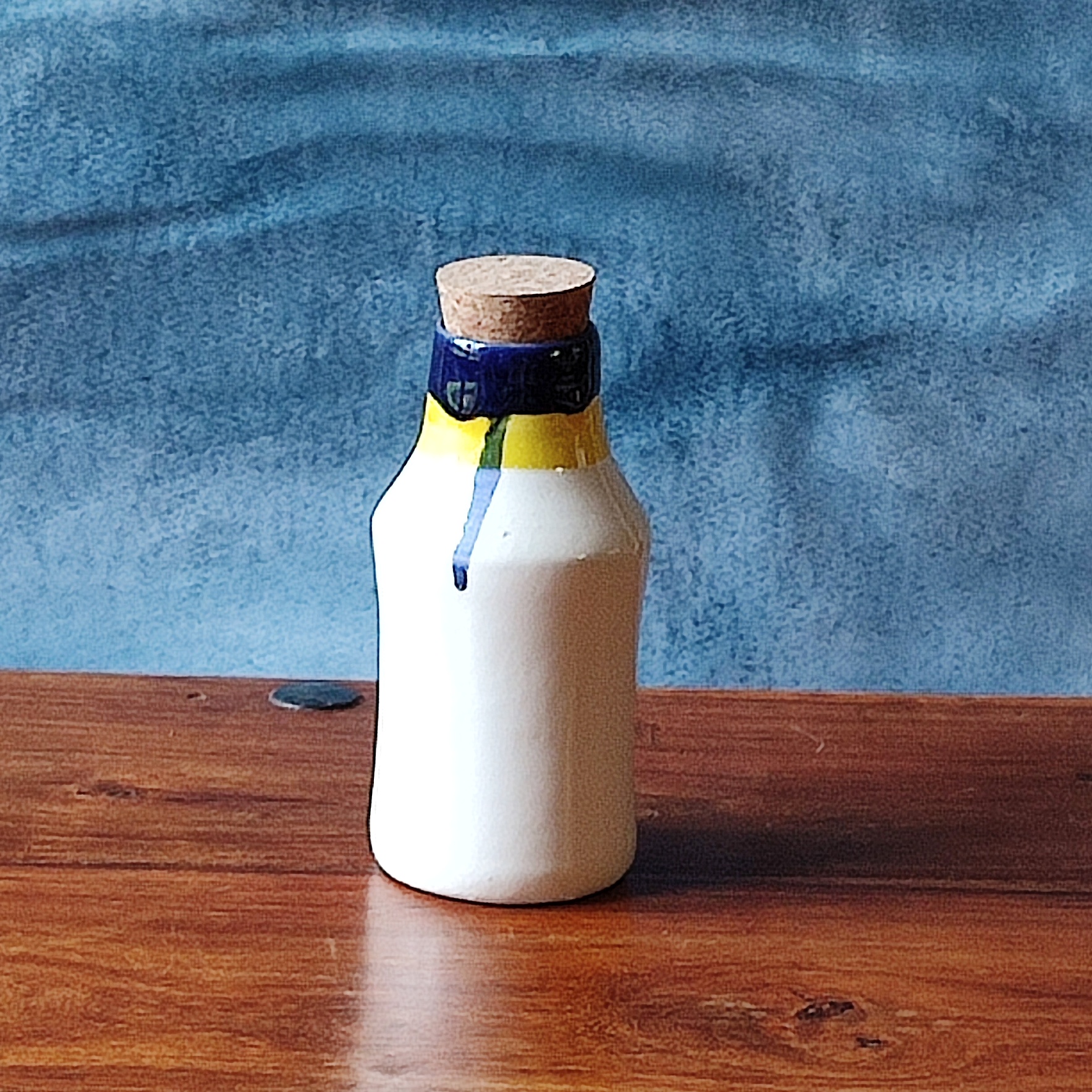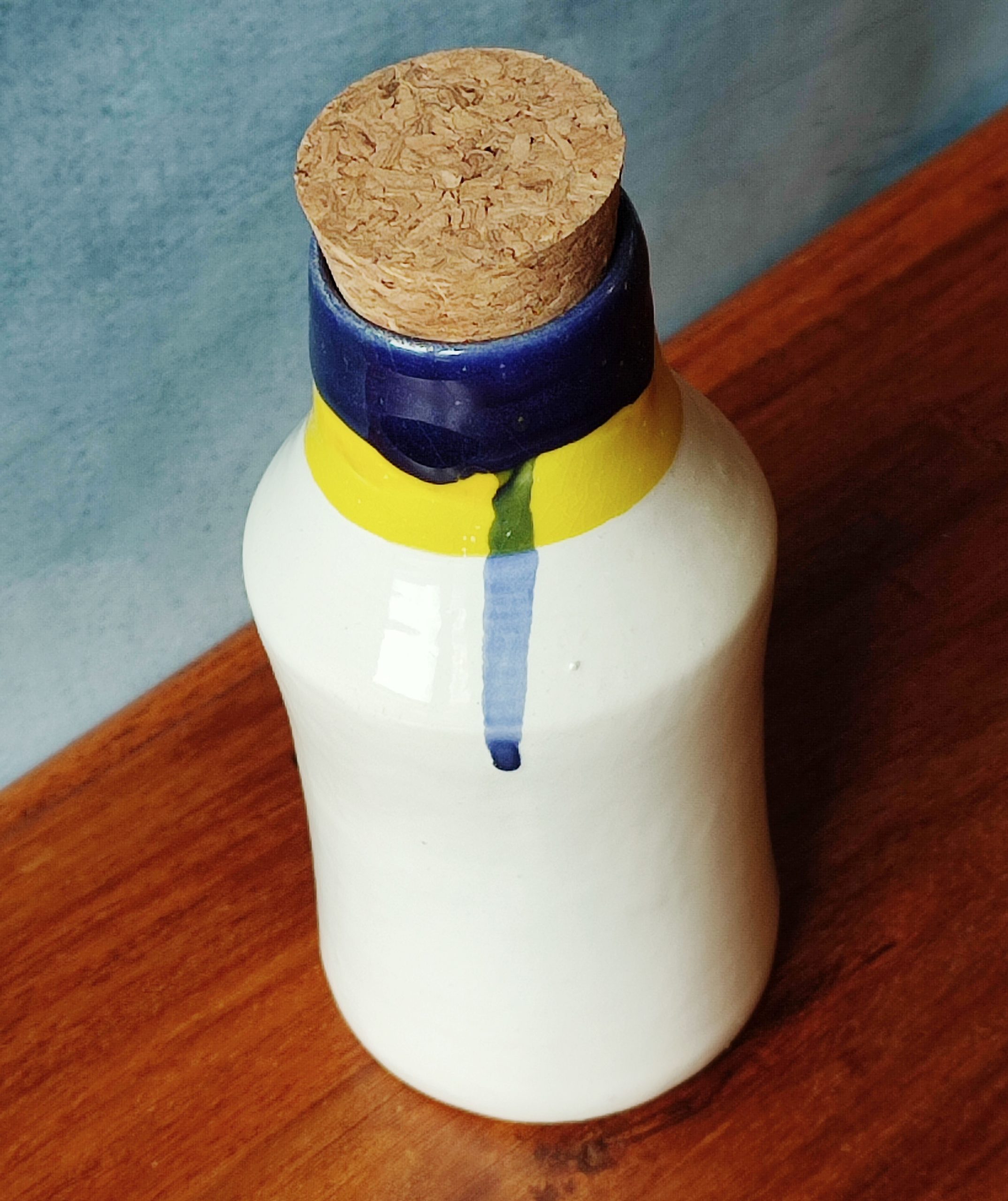 Découvrez une bouteille artisanale en grès blanc de 14 cm, entièrement façonnée et émaillée à la main. Son émaillage blanc soyeux, rehaussé d’un goulot vibrant jaune solaire et d’un bleu cosmos profond, crée un contraste lumineux unique. Les coulures d’émail naturelles, signature du travail artisanal, rendent chaque pièce absolument singulière et non reproductible.