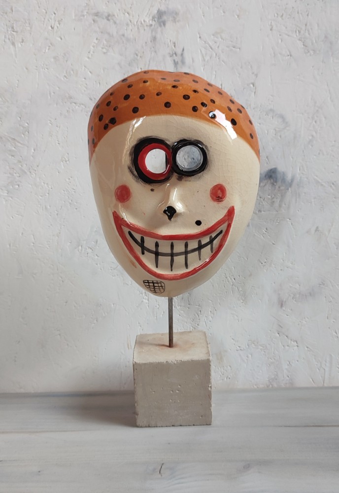 Mad Max est un masque en céramique artisanale qui explore la frontière entre le grotesque, l’enfance détournée et un monde post-apocalyptique imaginaire. Derrière son sourire exagéré et presque ludique se cache une tension plus profonde : celle d’un personnage qui semble rire malgré les fissures, les manques et les cicatrices.